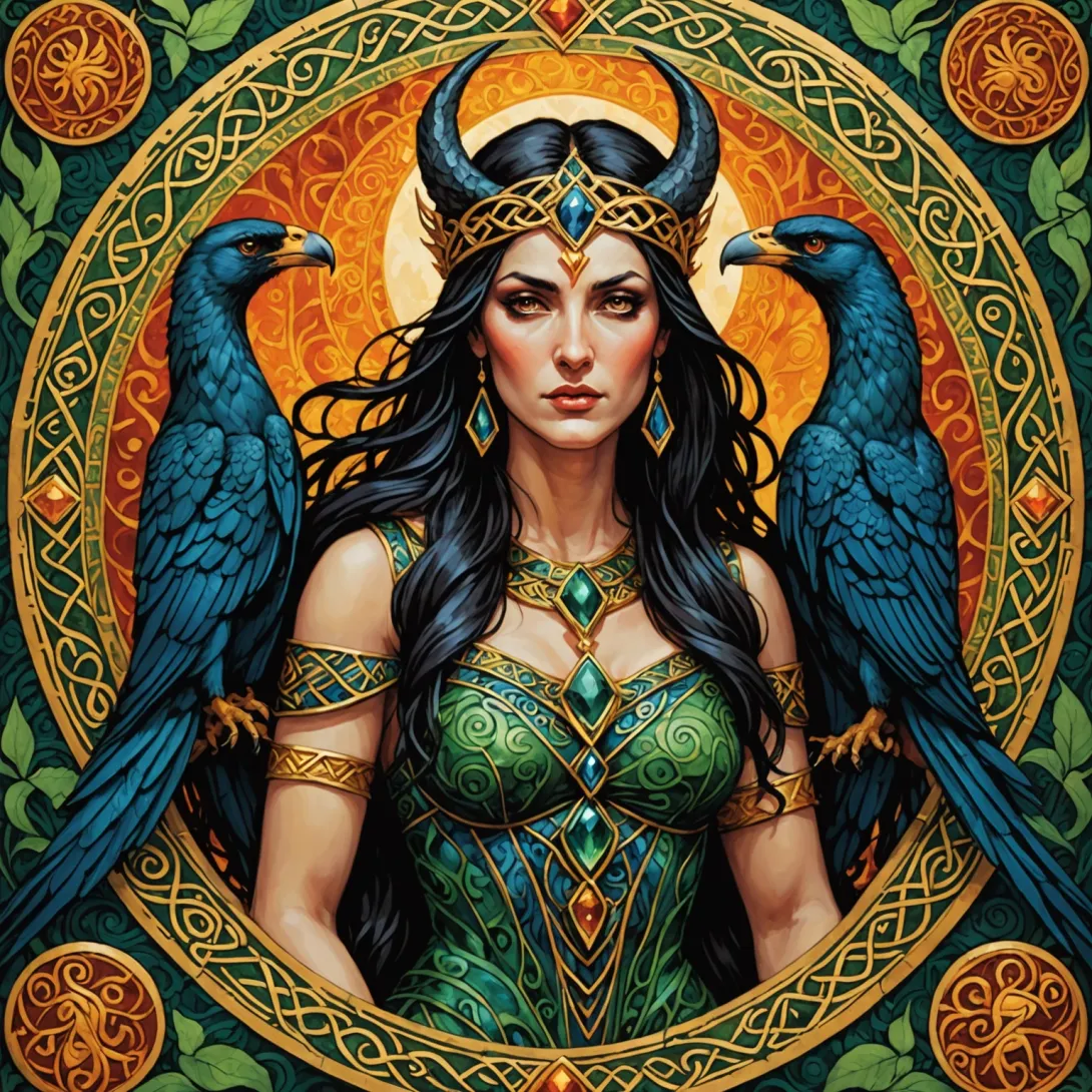 Морриган — это богиня войны, судьбы и смерти в кельтской мифологии. Её образ часто ассоциируется с вороной или вороном, символизирующим предвестие битвы и судьбы воинов.